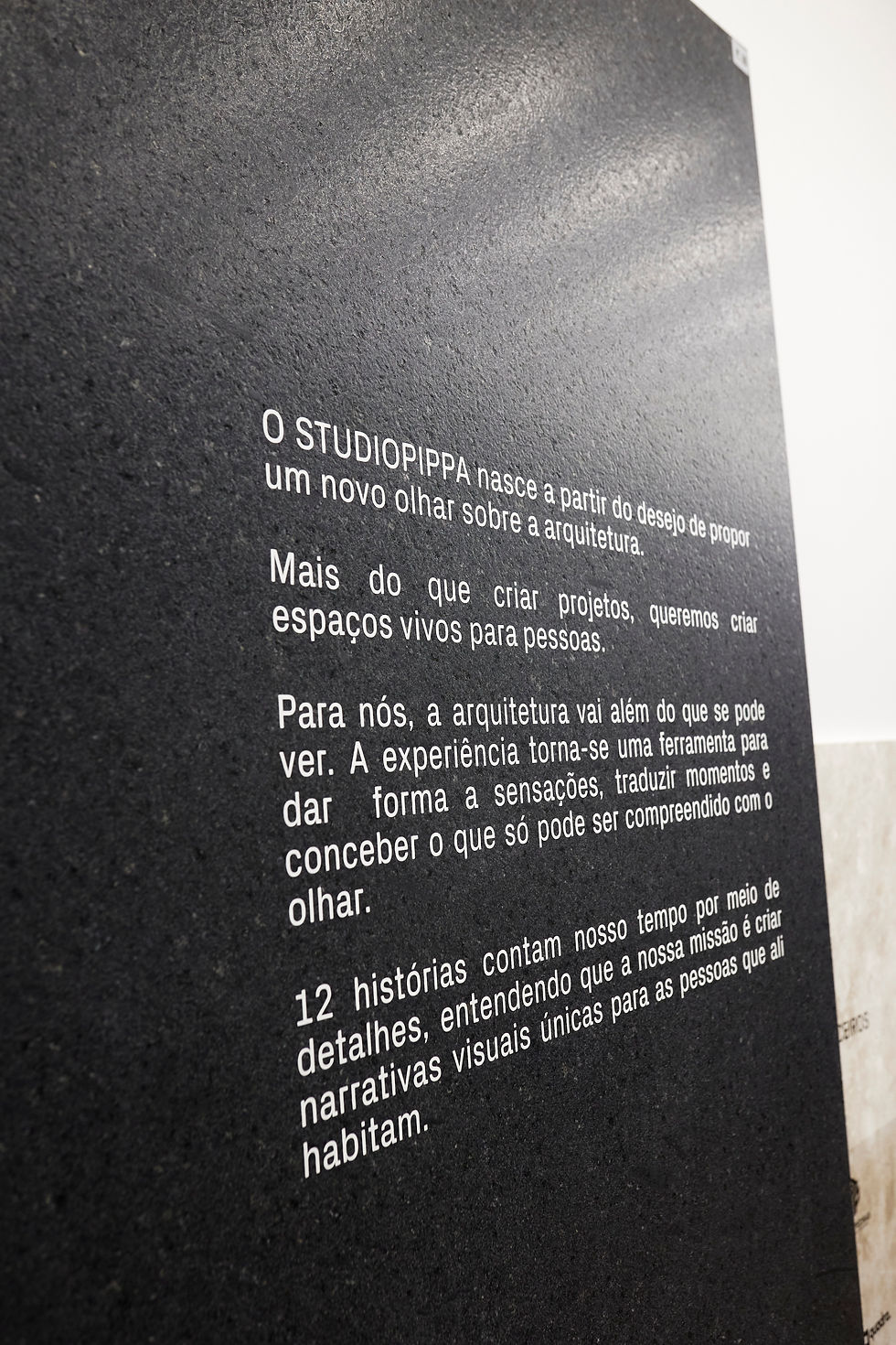 Plantas, textos e áudios dos nossos projetos foram expostos em compensado cru, blocos de concreto e porcelanato, o qual desenvolvemos especialmente para um dos nossos clientes. E para celebrar nossas histórias, inventamos mais uma. A qual foi contada em um filme que produzimos na Casa VP.