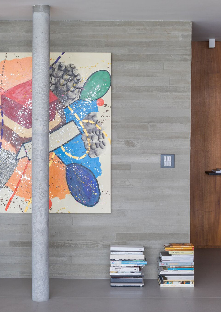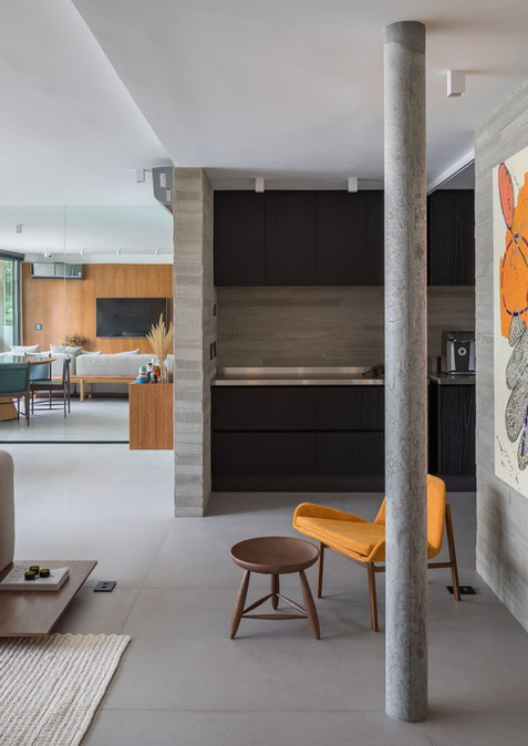 O estudo para a escolha de materiais aplicados se pautou em seguir com repertório brasiliense. Dessa forma o concreto aparente e a madeira freijó são protagonistas no cenário. Infelizmente o imóvel não possuía mais o tradicional taco de madeira, mas para não faltar esse símbolo em projeto, aplicamos nos quartos o piso em madeira com a tecnologia que hoje é desenvolvida nesse seguimento. Durante a obra, foram encontradas três tubulações verticais até então inexistentes em levantamentos de plantas antigas do prédio. Para contornar a situação, concretamos as tubulações e o resultado foram colunas circulares soltas nos ambientes.